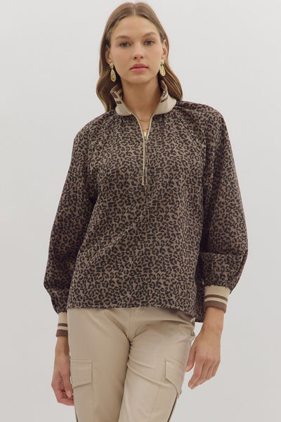 Leopard Print Long Sleeve Zip-Up Mock Neck Top