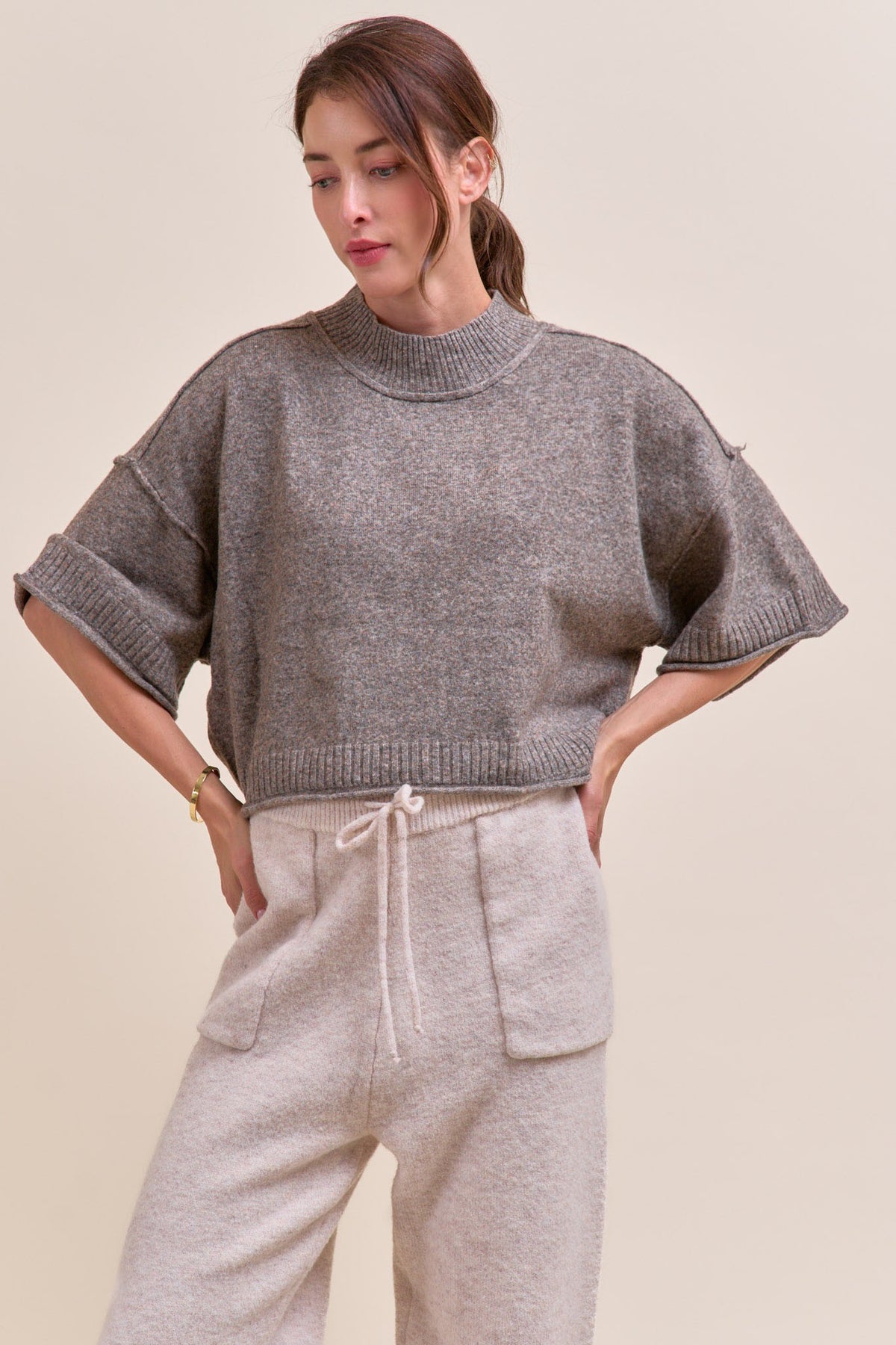 Charcoal Brown Mock Neck Short Sleeve Sweater