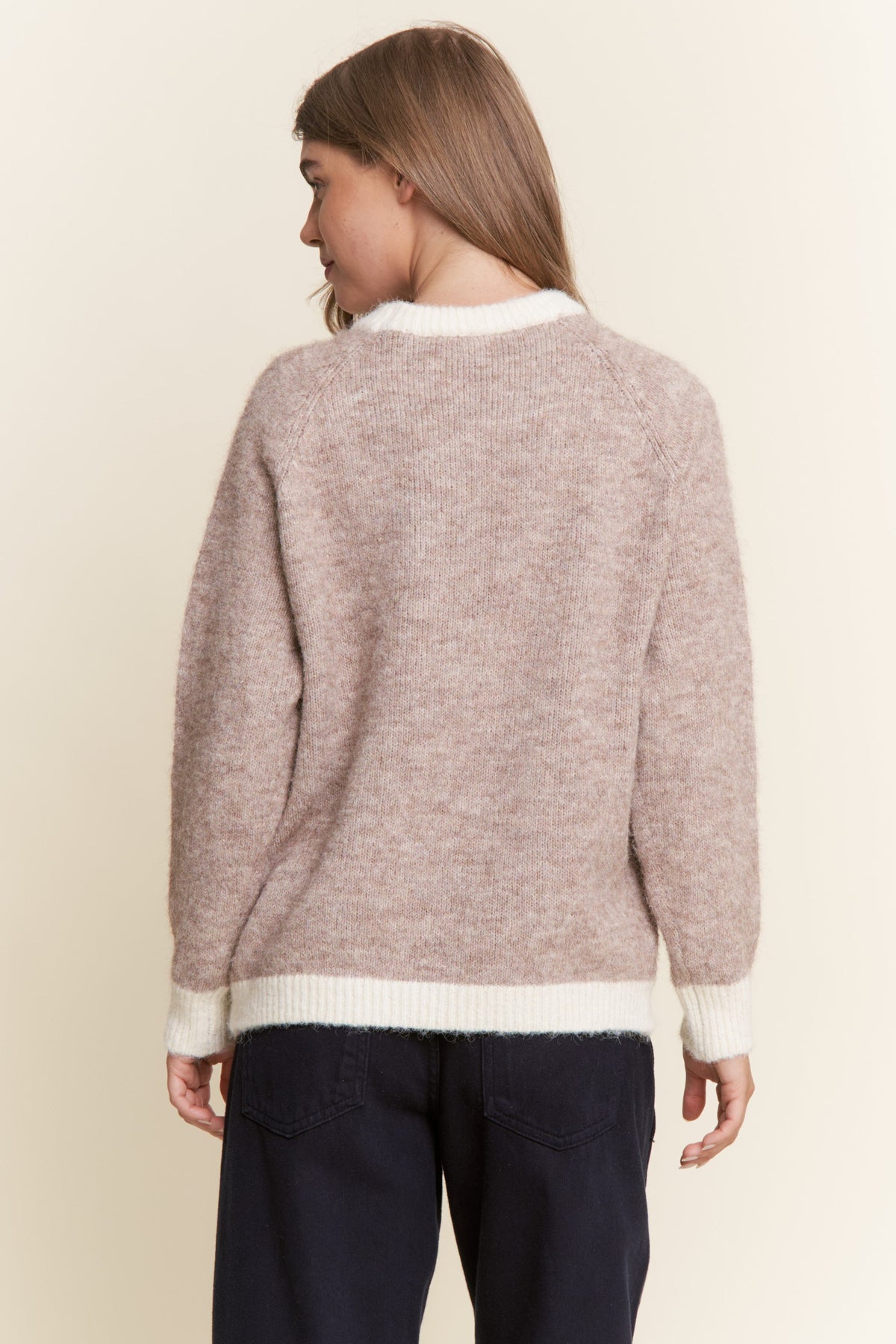 Embroidered snowflakes at the front and color block neckline, sleeves, and bottom hem. Soft non-itchy fabric