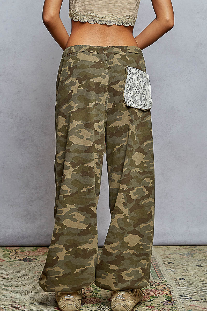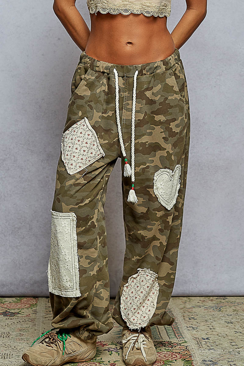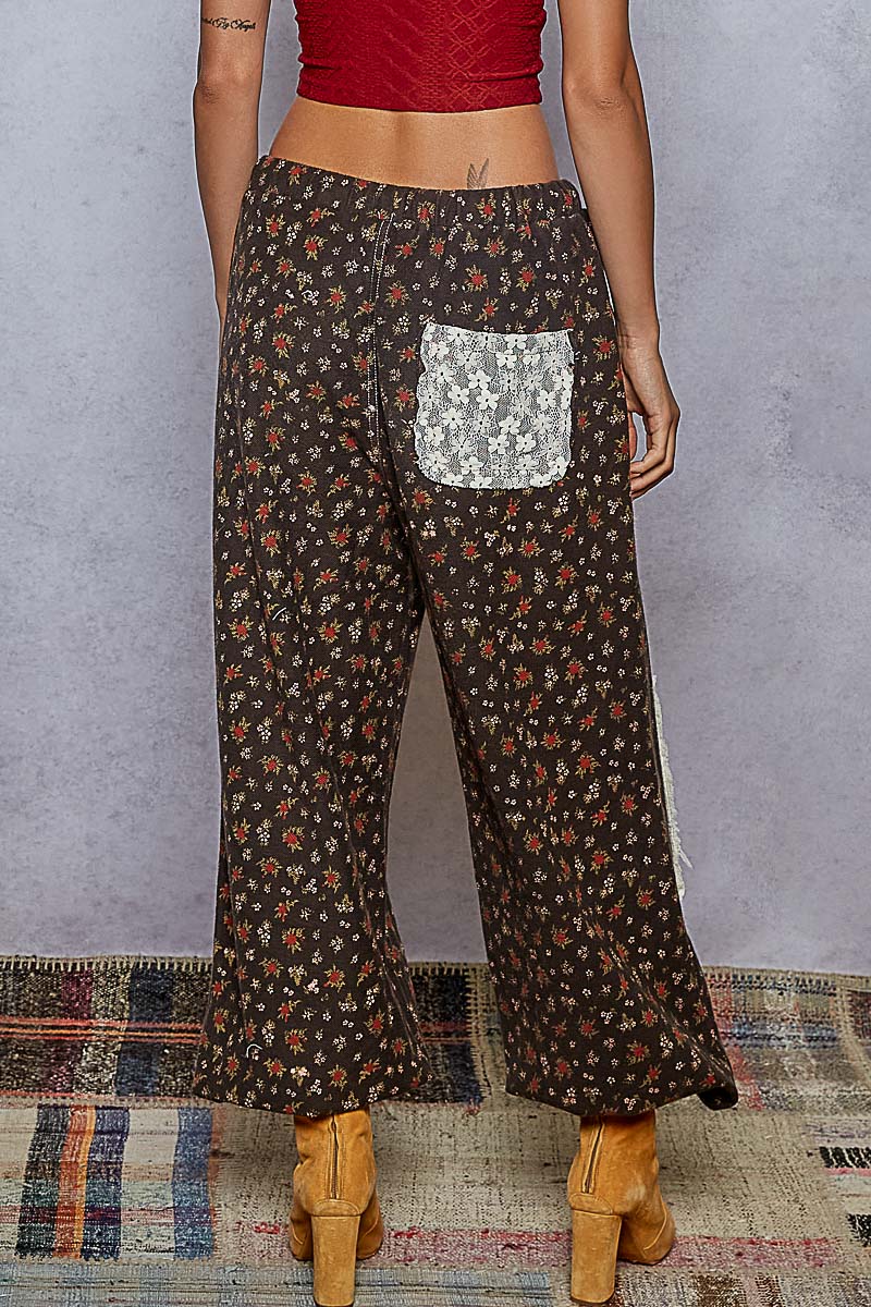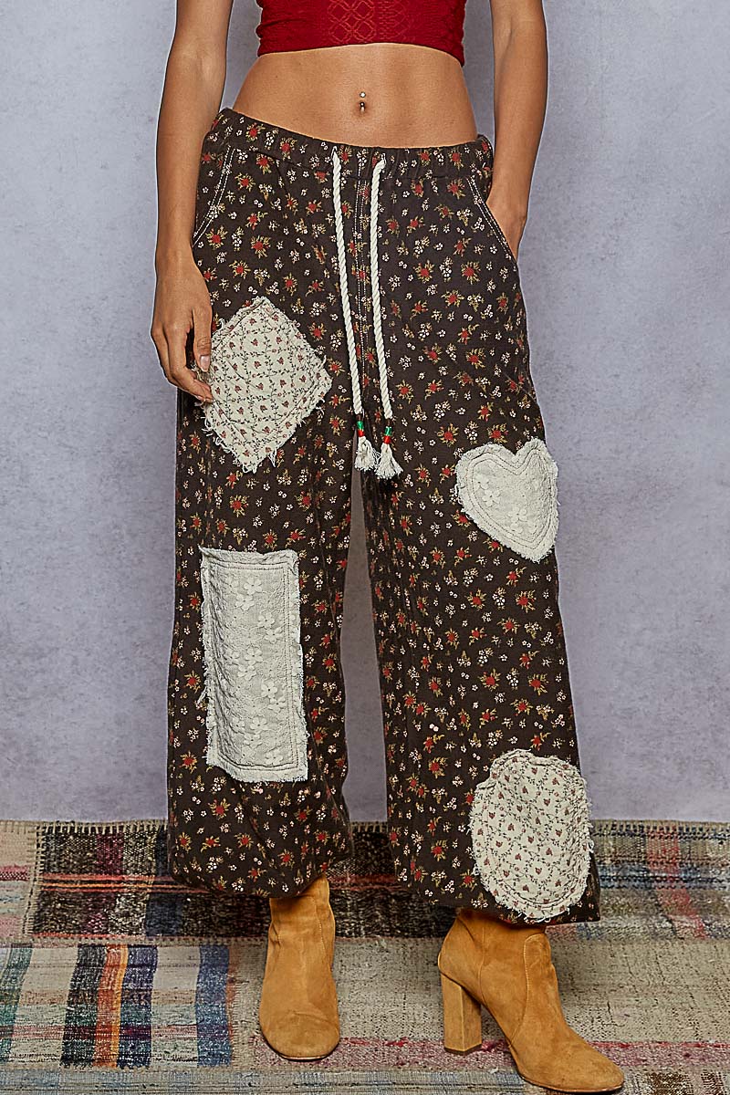 Roomy fit bottom in printed French terry with varied lace and woven patches and accented drawstring.