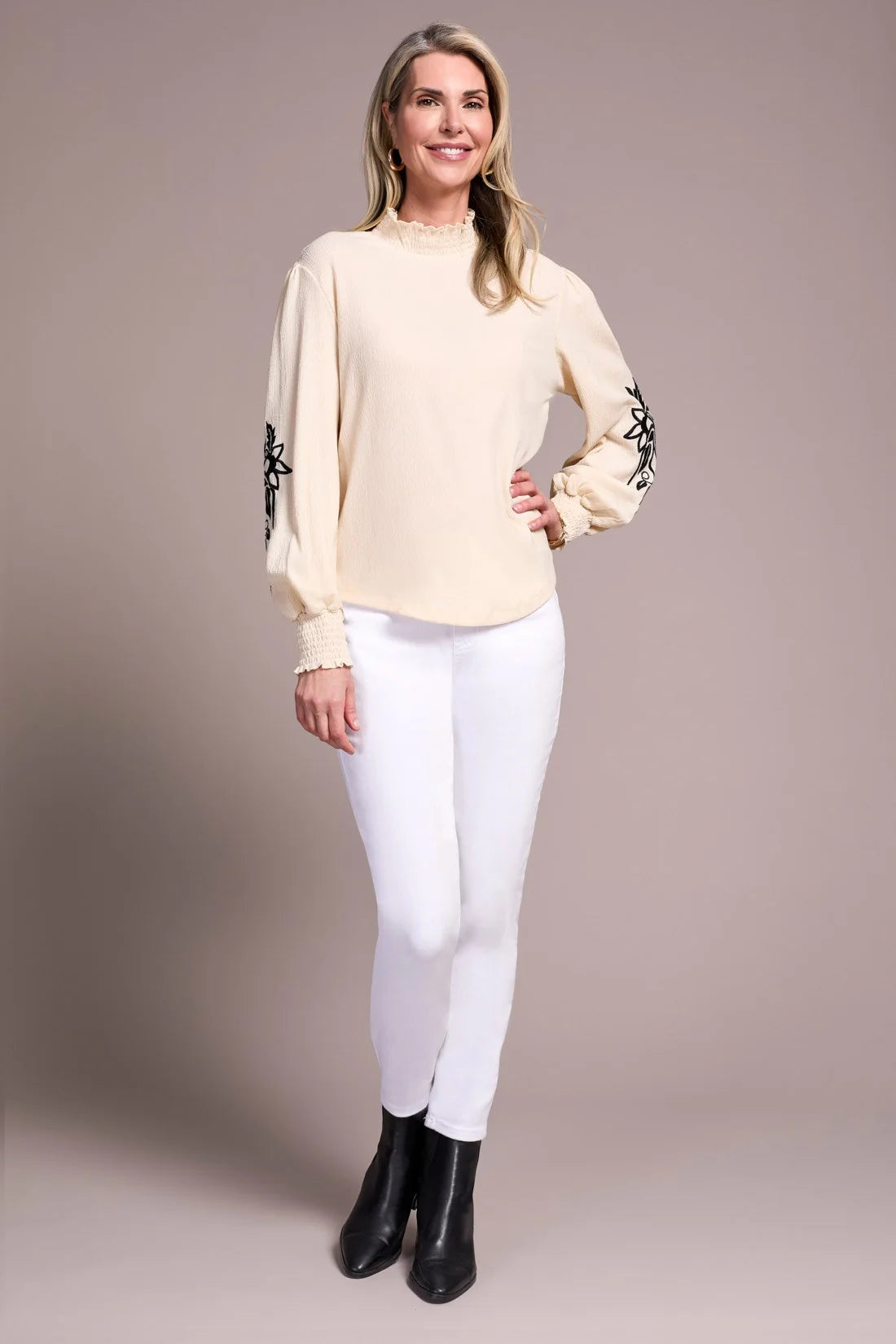Opt for refined ease in a top elevated by an elegant mock neck and softly structured long sleeves. Smocked detailing at the cuffs and neckline adds gentle stretch and definition, while the crinkled knit fabric brings rich texture. Subtle sleeve patterning completes the look with a polished finish.