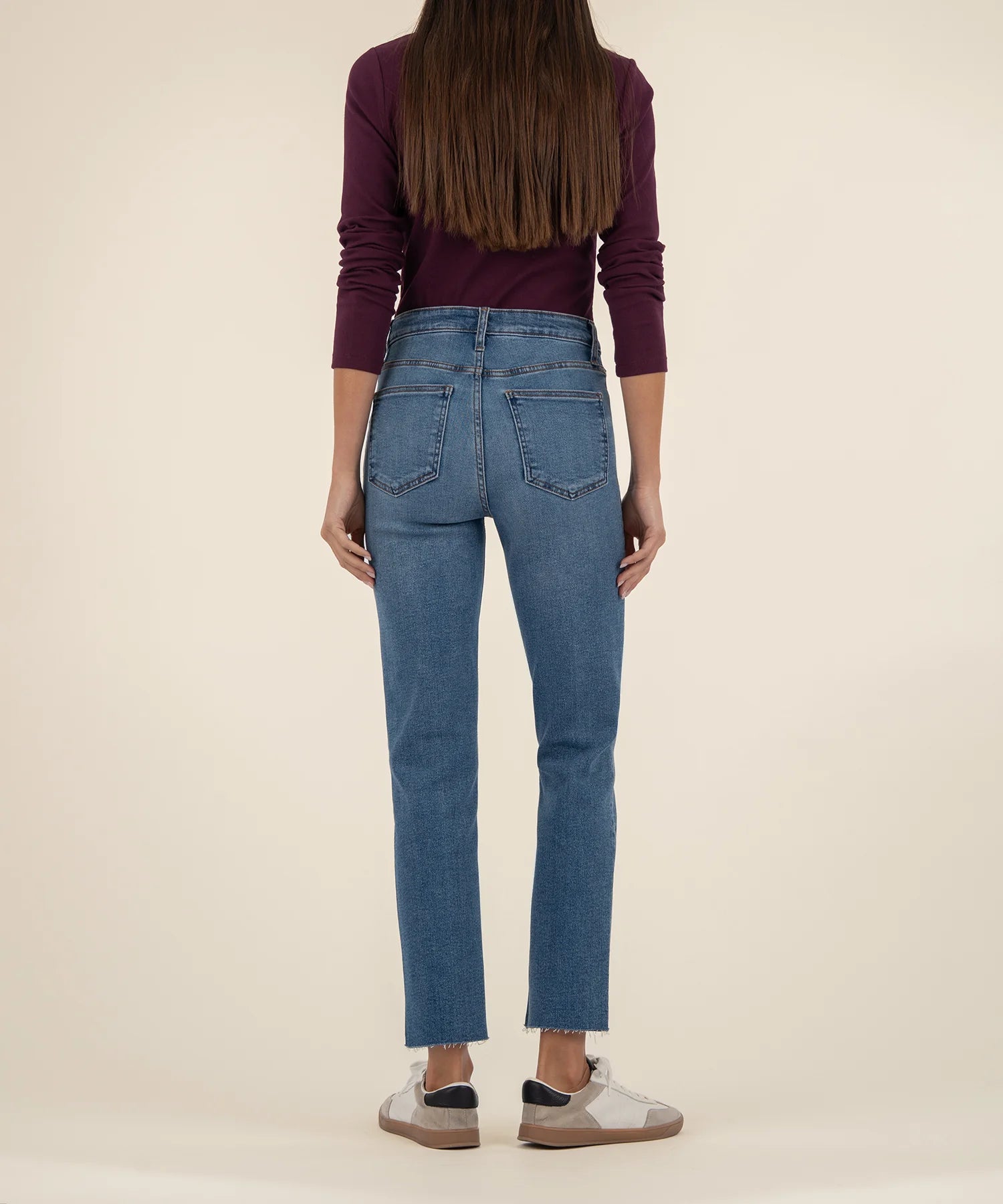 These Kut from the Kloth high-rise mom jeans offer a clean, modern take on a classic silhouette. Designed in a medium wash with Fab Ab pockets for a flattering fit, they feature a raw hem and are made from stretchy material for all-day comfort and style.