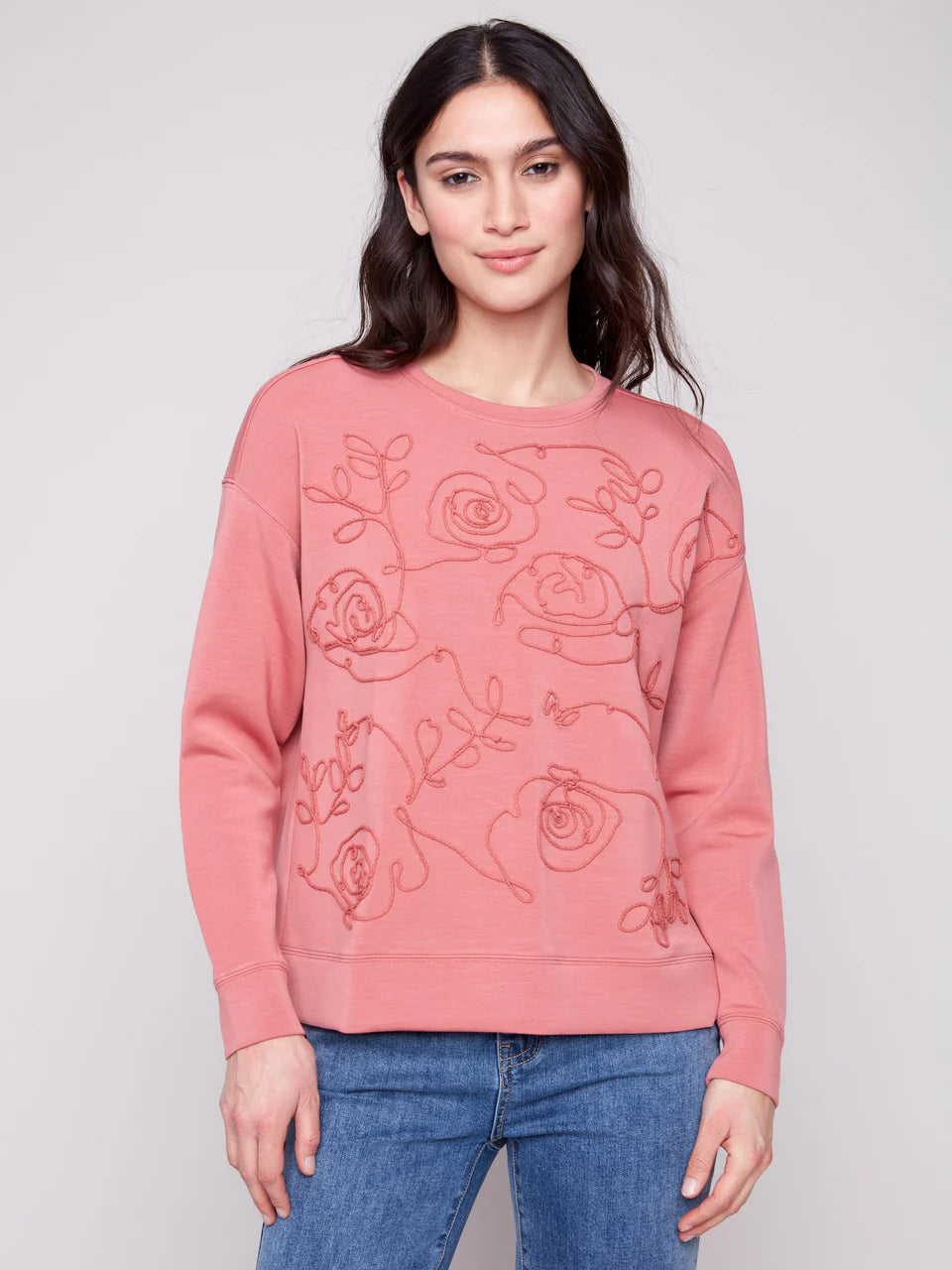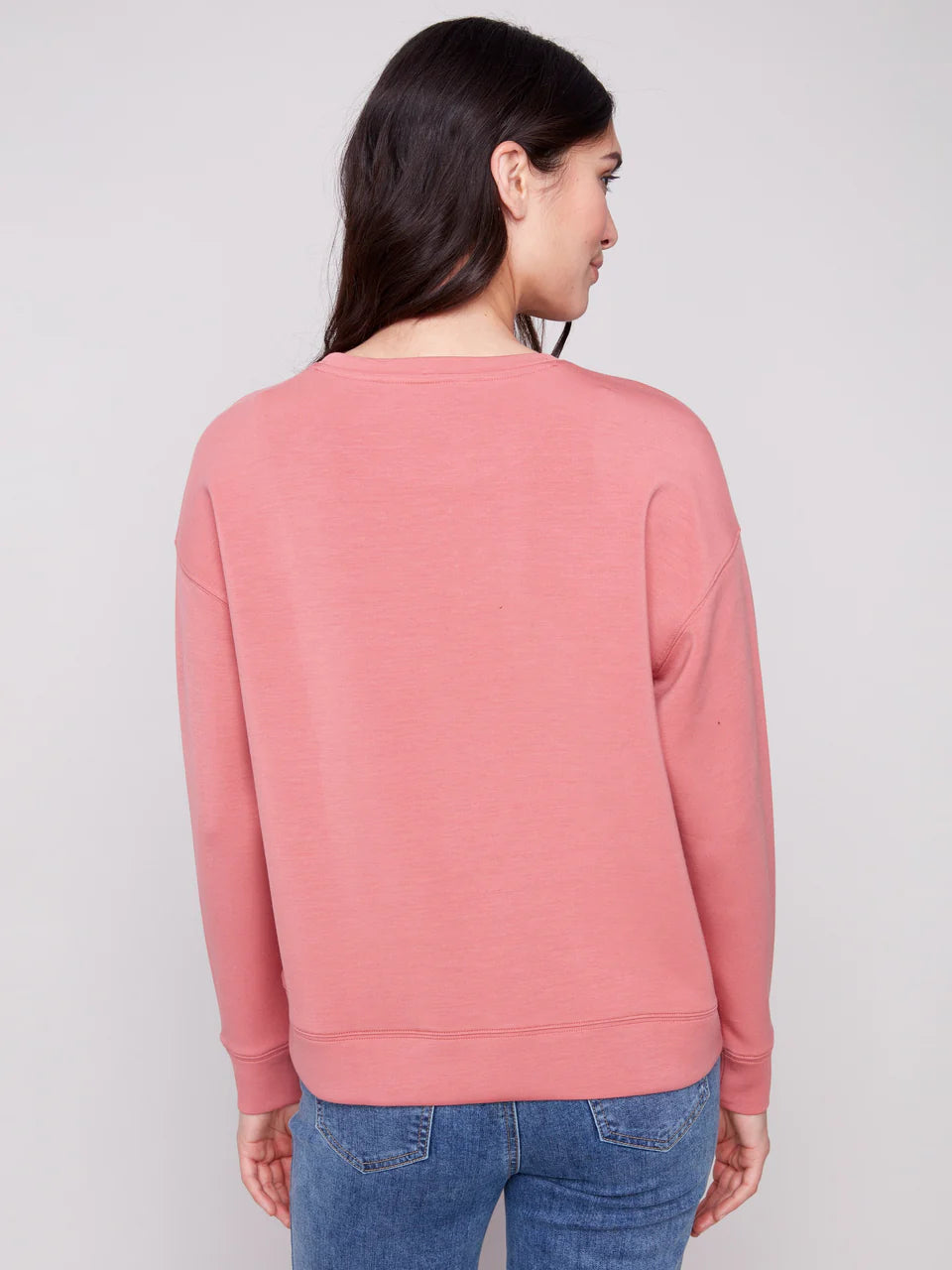 Elevate your casual style with Charlie B's Scuba Knit Top, a true style masterpiece. The captivating primrose pink color highlights the intricate soutache detailing, making this top a versatile must-have for your fall wardrobe. Crafted from soft, stretchable fabric, it ensures all-day comfort, while the classic crew neck adds timeless charm.