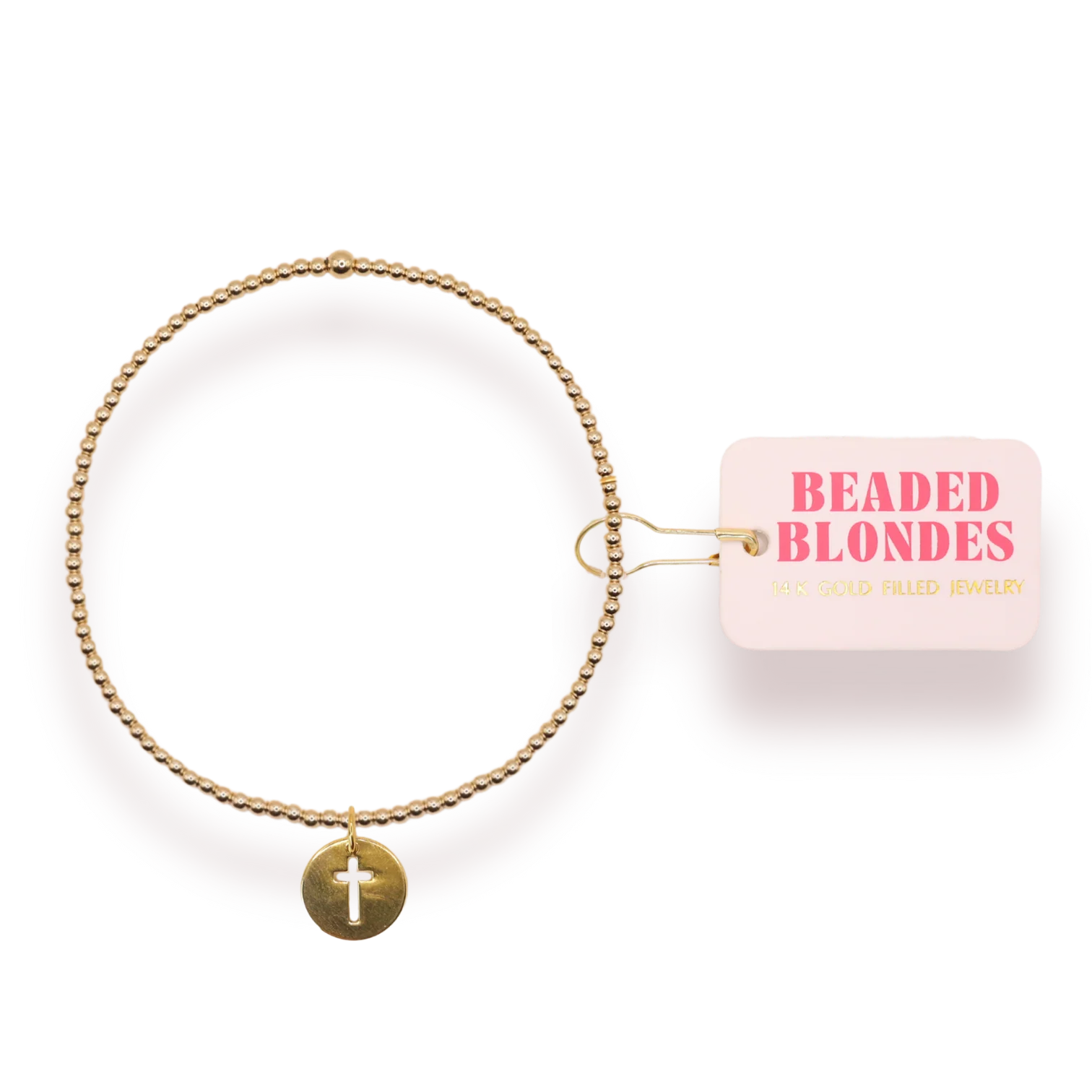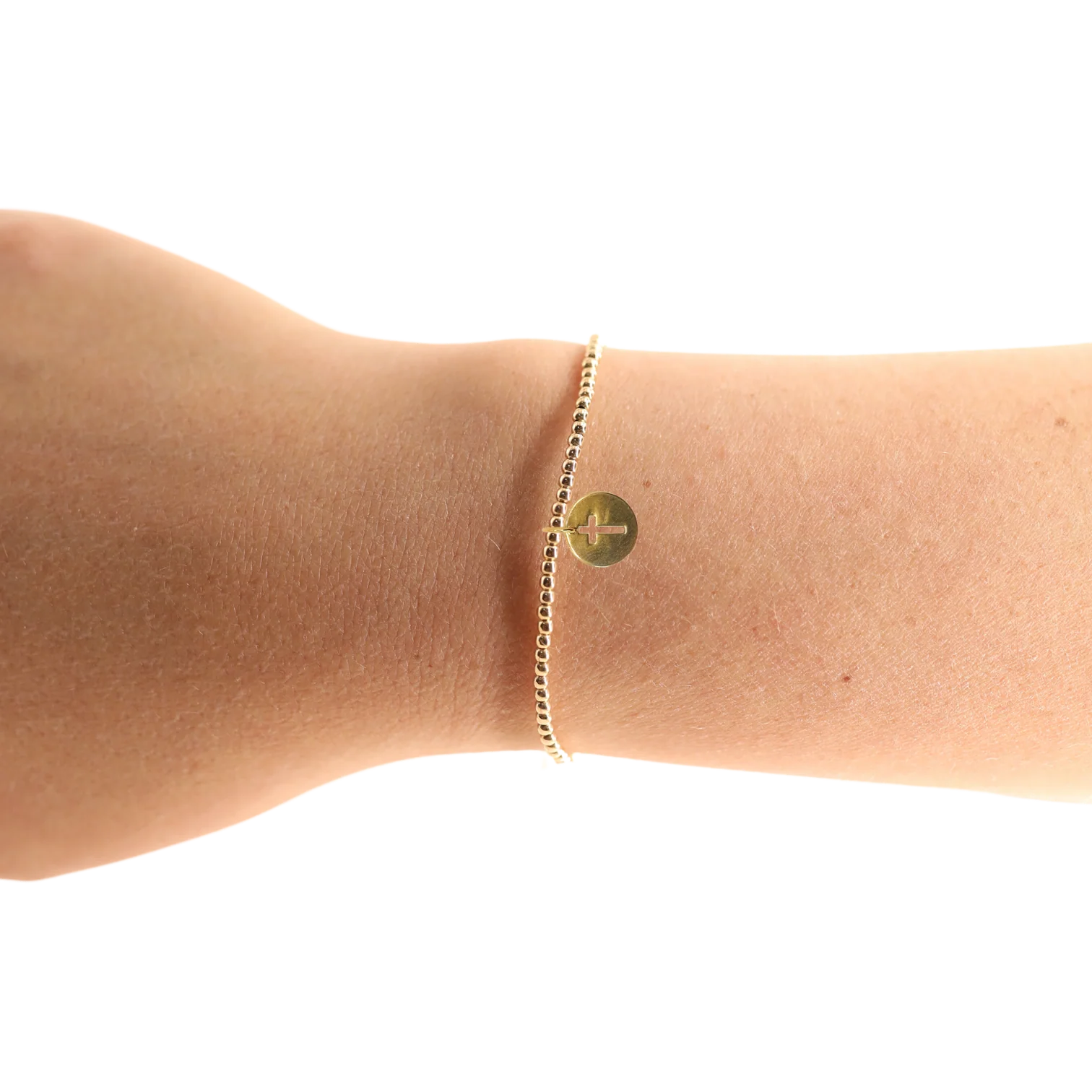 2MM gold beaded stretch bracelet with gold cross cutout coin charm.