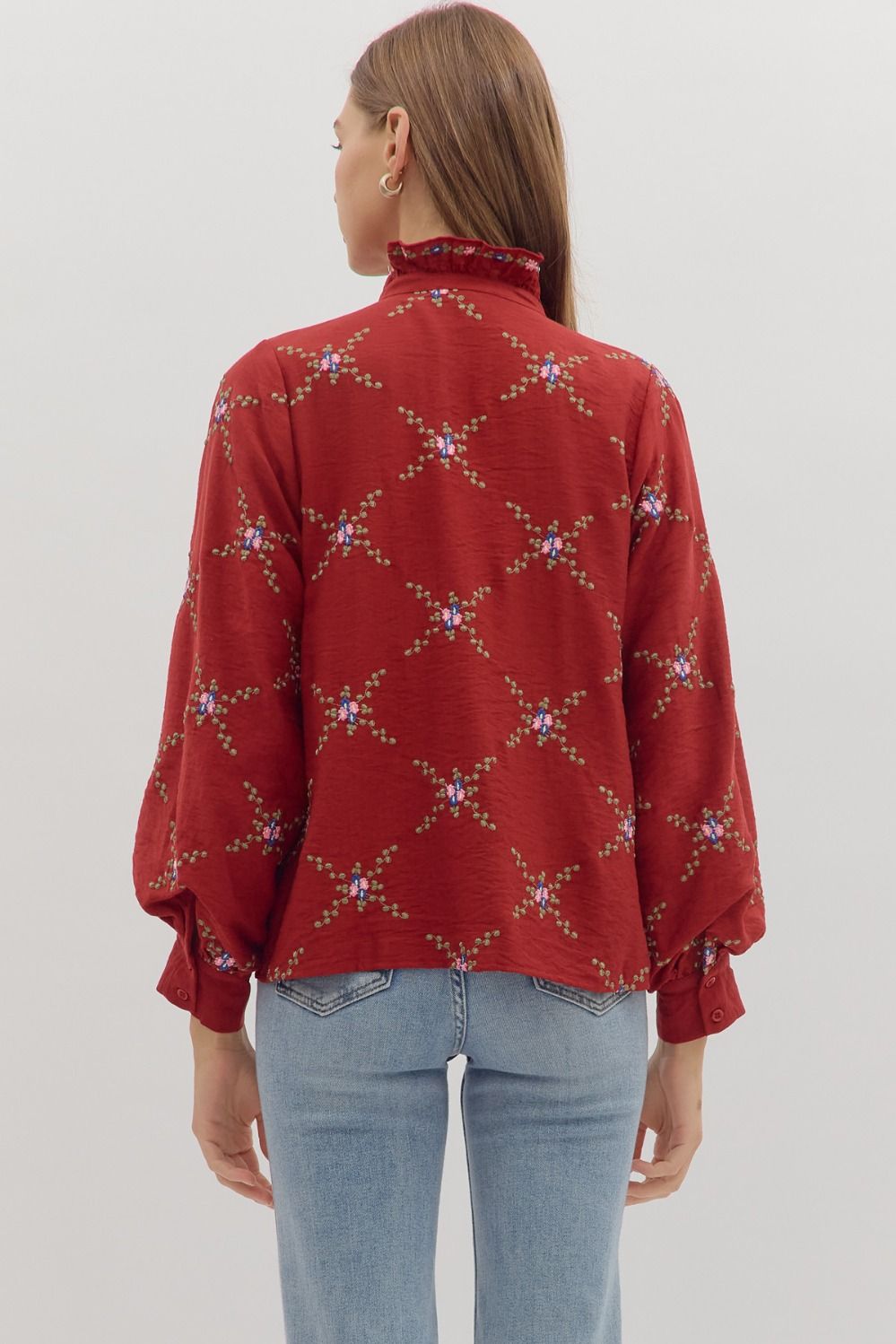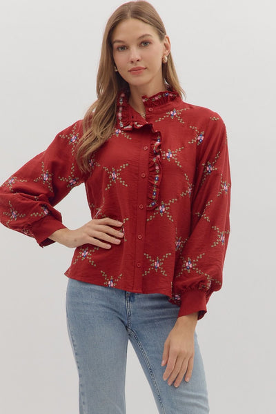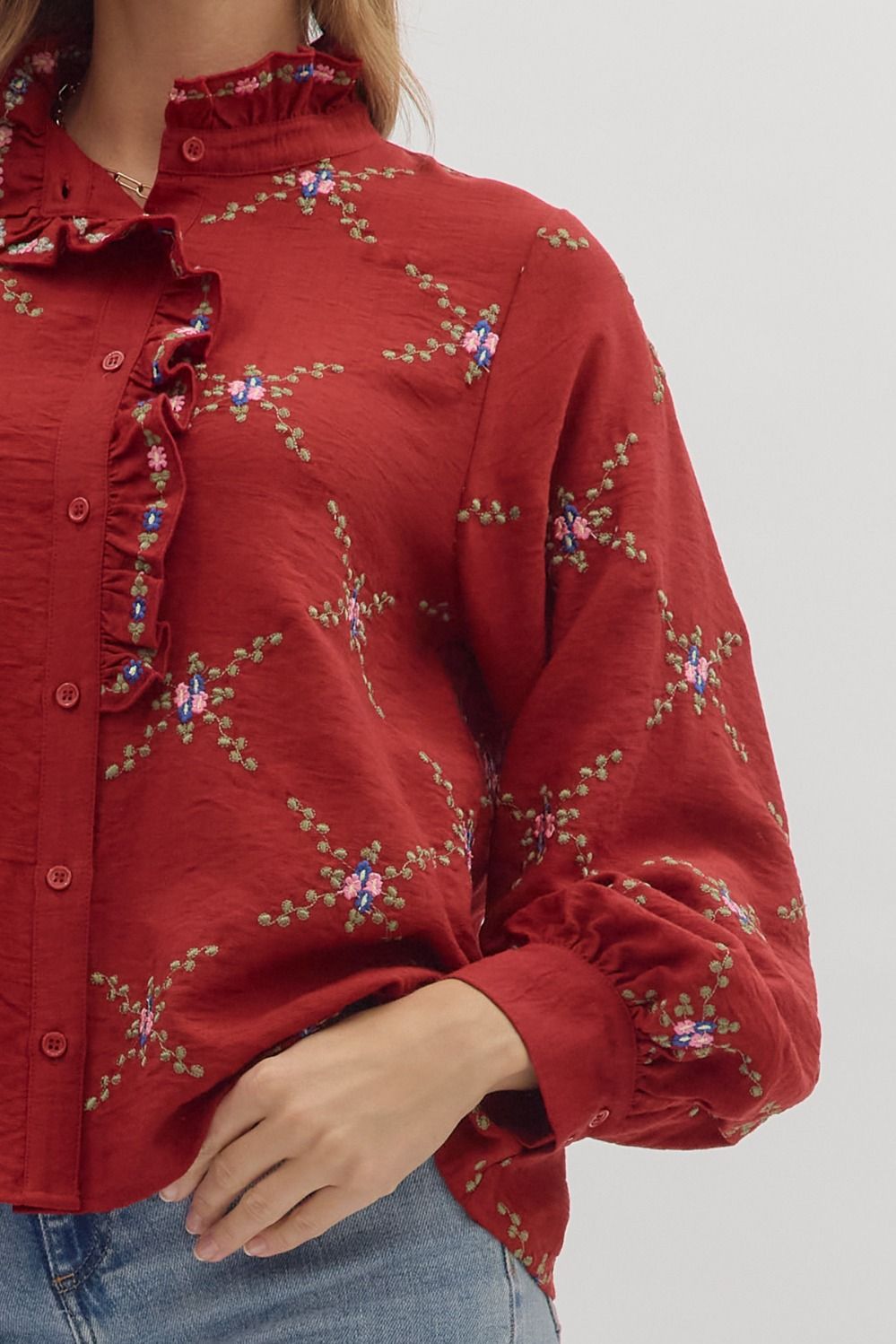 Floral embroidery long sleeve button-down top featuring ruffled trim at neckline and placket. Button closure at front. Button cuffs.